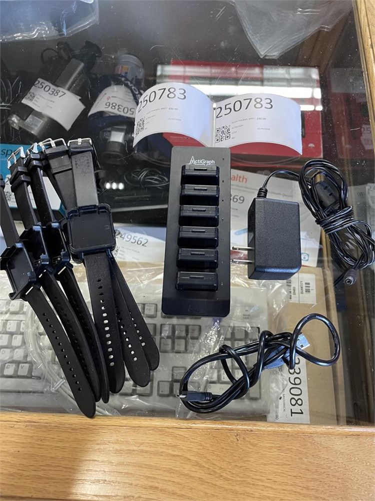 POWERS ON, NOT TESTED FURTHER, INCLUDED CHARGING BASES, CABLES, AND WRIST BAND